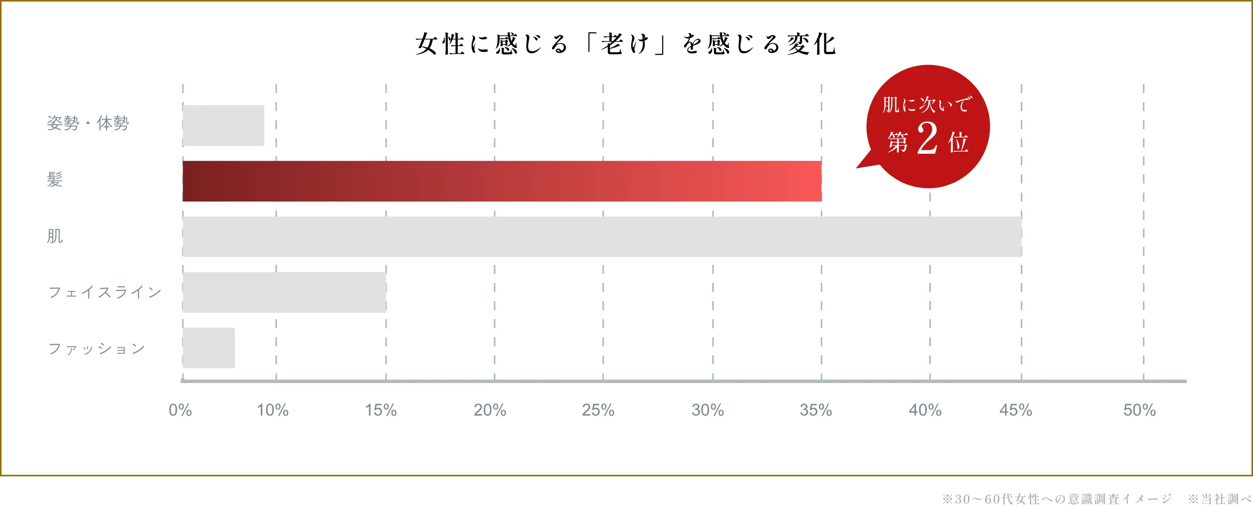 女性の年齢変化として最も認識されやすいのは「肌」ですが、それに次いで「髪」も、老けた印象に強く影響する要素であることがうかがえます。肌と同様に、髪も年齢印象を左右する重要な存在です。